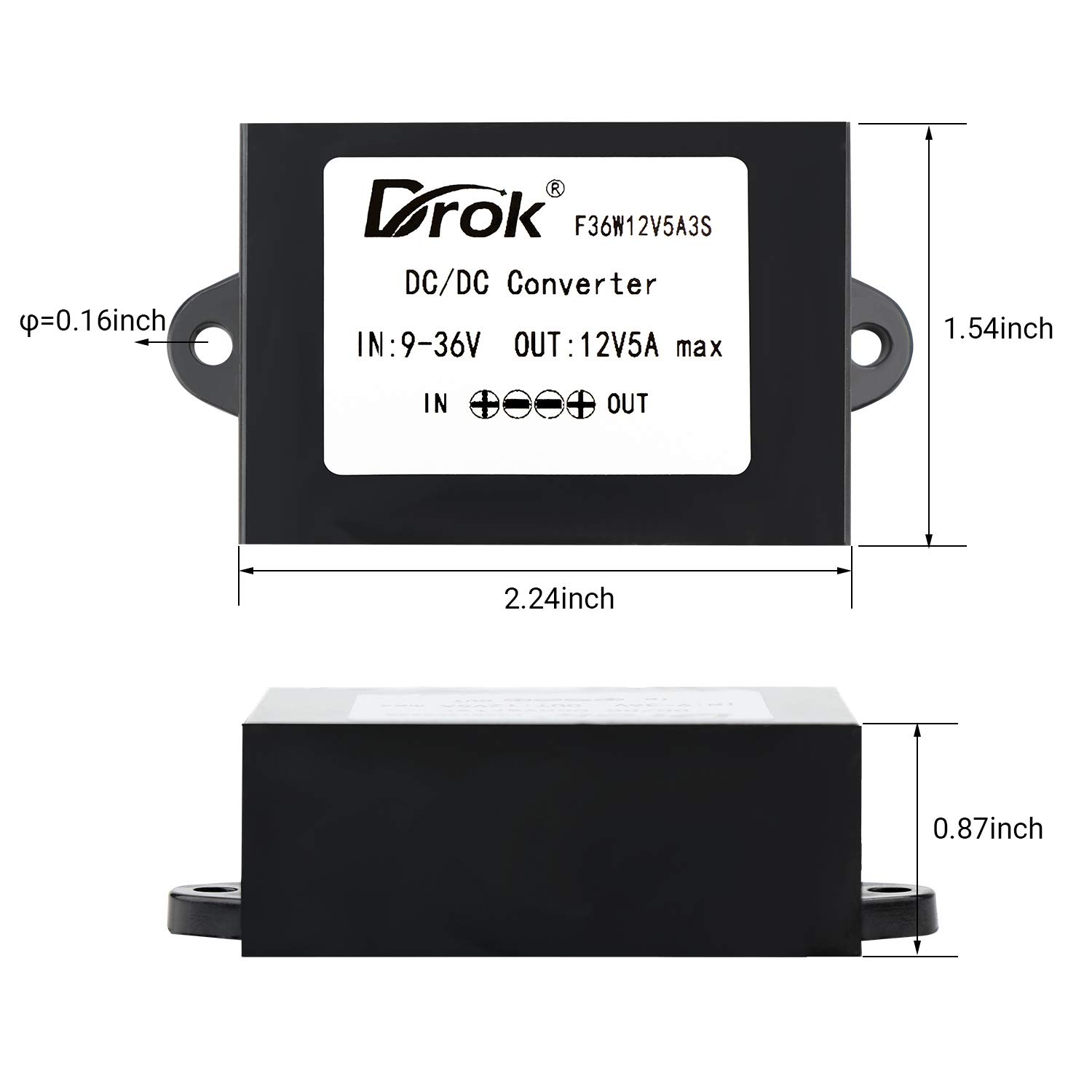 - PARAMETER --- DROK DC-DC converter input voltage range is DC 9~36V (12V); output voltage is DC 12V; output current is 5A; output power is 60W.