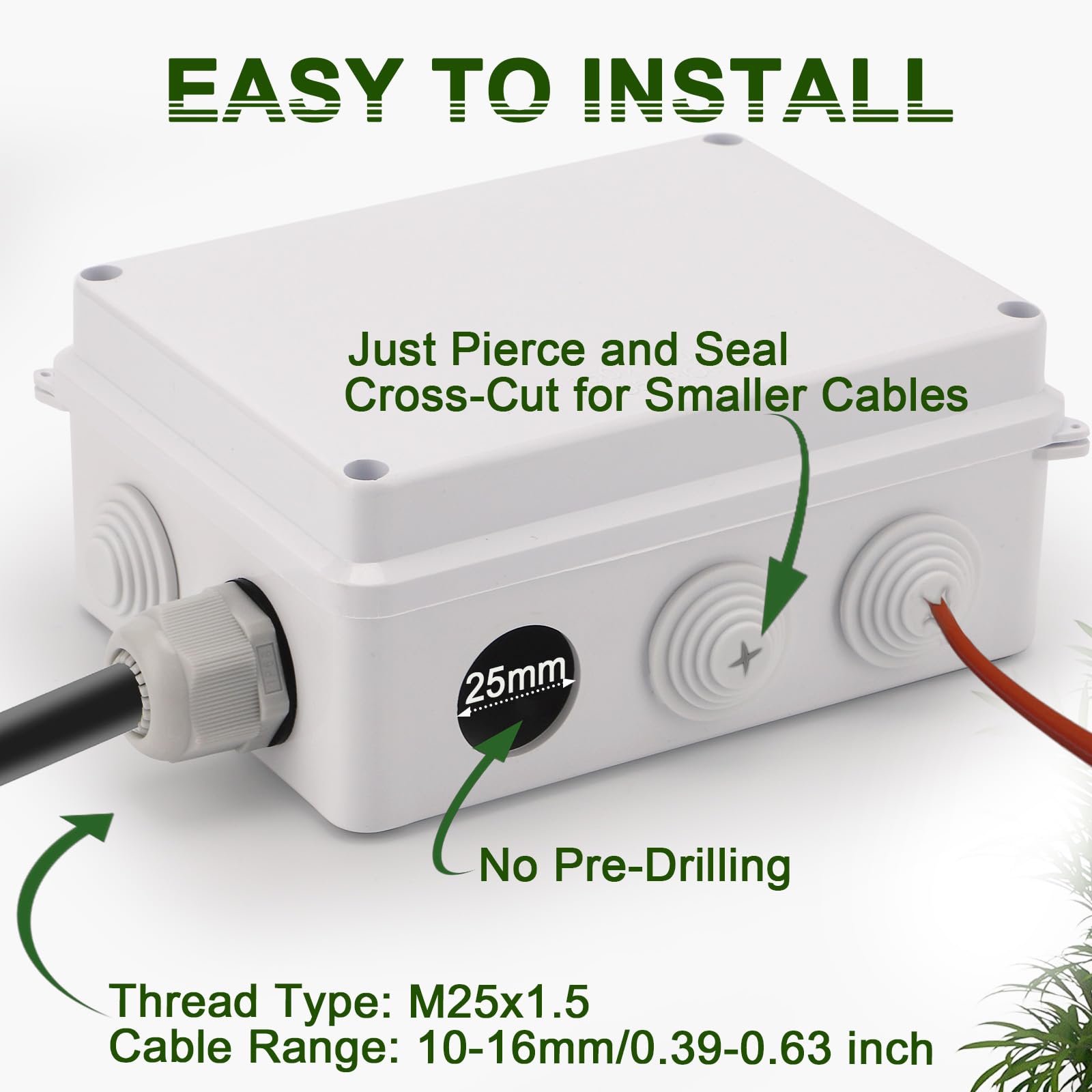 - 【Included Components】 1 outdoor junction box waterproof with built-in rubber grommet; 4 stainless steel cover screws; 4 self-tapping mounting screws; 4 expansion bolts; 2 waterproof cable glands.